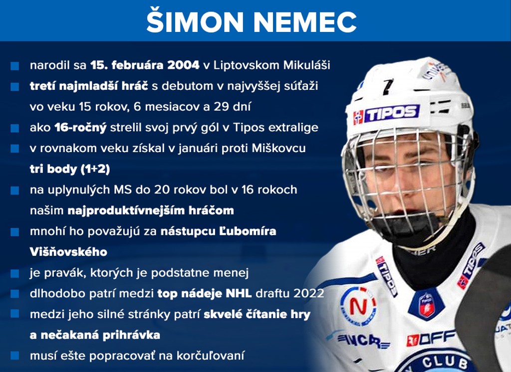 Šimon Nemec vo februári oslávil len 17. narodeniny, jeho talent je však nesporný. Okrem toho, že je pravák, ktorých je ako šafranu, vyhral v drese Nitry ligové bodovanie hráčov do 20 rokov. S 19 bodmi v 37 zápasoch tak schoval do vrecka aj o tri roky starších hokejistov.
