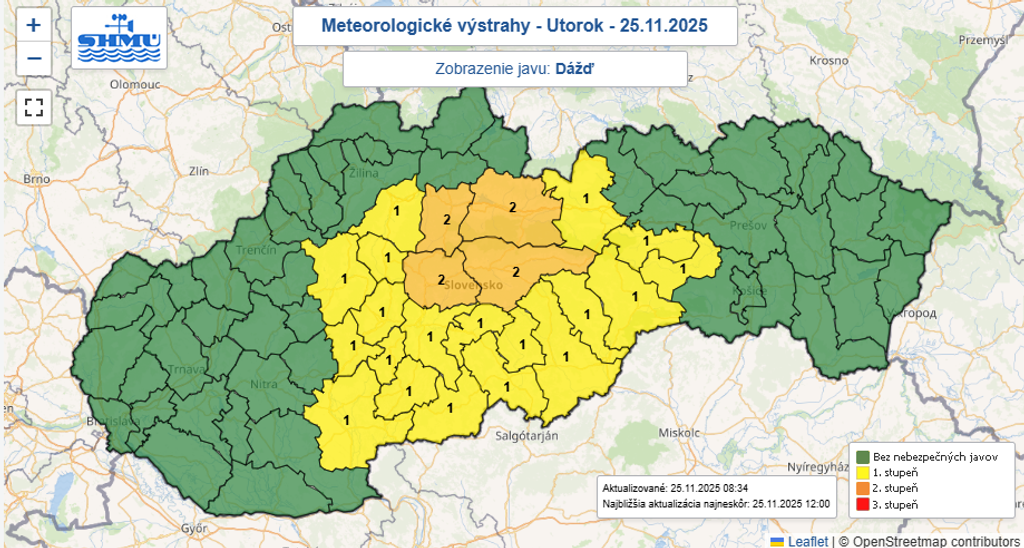 V niektorých častiach Slovenska má celý deň pršať. Výstraha prvého stupňa pred dažďom platí až do stredy (26. 11.) v okresoch Prievidza, Gelnica, Rožňava, Spišská Nová Ves, Poprad, Martin a Turčianske Teplice.