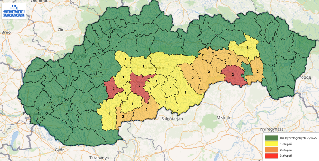 V okresoch Žarnovica, Zvolen a Košice-okolie (rieka Bodva) vydal Slovenský hydrometeorologický ústav (SHMÚ) tretí stupeň výstrahy pred povodňou z topiaceho sa snehu a dažďa. Druhý stupeň platí v okresoch Levice, Veľký Krtíš, Revúca, Rožňava, Spišská Nová Ves, Gelnica a v časti okresu Košice-okolie (rieka Hornád).