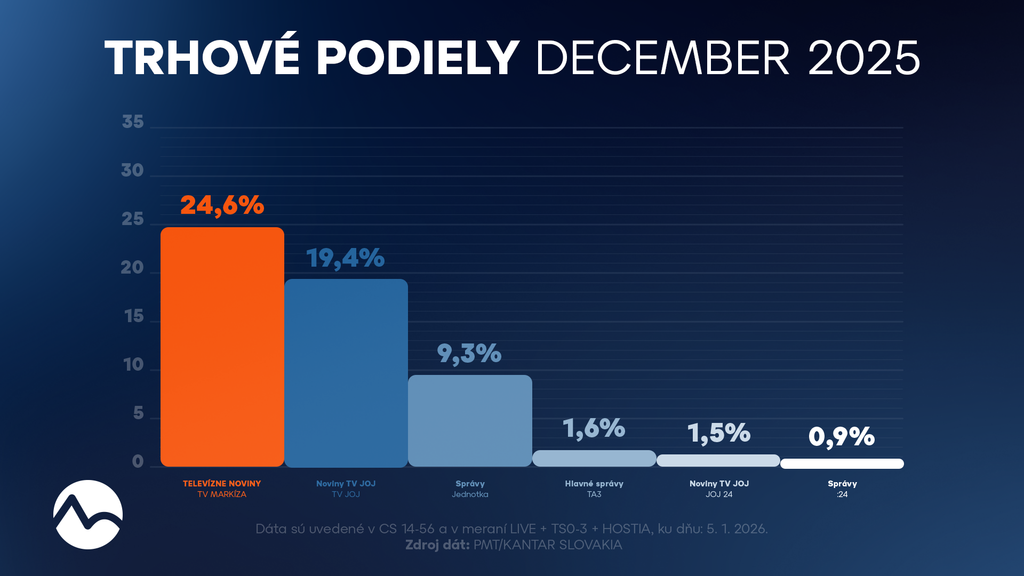 Televízne noviny si na obrazovkách televízie Markíza aj v decembri 2025 udržali pozíciu najsledovanejšej hlavnej spravodajskej relácie na Slovensku a potvrdili svoju silu naprieč všetkými kľúčovými ukazovateľmi. Jednotkou na televíznom trhu boli v každý jeden decembrový deň, pričom hlavné večerné spravodajstvo o 19:00 hod. zasiahlo kumulatívne až takmer 2,6 milióna divákov vo veku nad 12 rokov. Ide o výrazný medzimesačný nárast, ktorý potvrdzuje stabilný divácky záujem aj počas sviatočného obdobia.