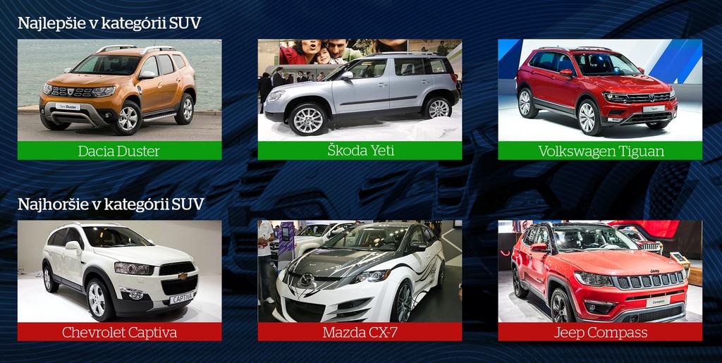 Slovenskí motoristi majú v obľube stále viac vozidlá typu SUV. Čo sa týka trhovej ceny, medzi päťročnými autami si najlepšie držia hodnotu Dacia Duster, Škoda Yeti a Volkswagen Tiguan. Naopak, najväčší percentuálny rozdiel medzi cenou nového a jazdeného vozidla majú po piatich rokoch užívania Chevrolet Captiva, Mazda CX-7 a Jeep Compass.