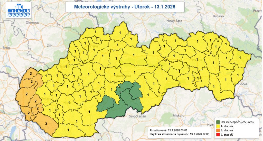 Výstraha prvého stupňa pred snežením platí do 14.00 h. Spadnúť môže približne desať centimetrov nového snehu. SHMÚ vydal tiež upozornenie na smogovú situáciu pre častice PM10 pre oblasť Jelšavy.