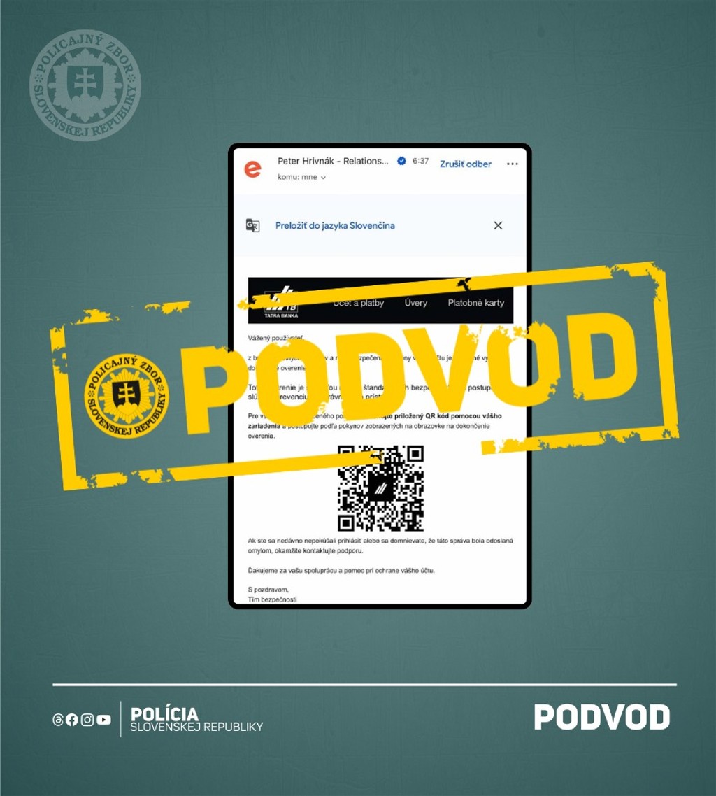 Polícia upozorňuje na podvod, ktorý sa v ostatných dňoch šíri. Ľuďom do mailu chodia QR kódy v menej nejakej banky, hoci daný používateľ ani nie je jej klientom.