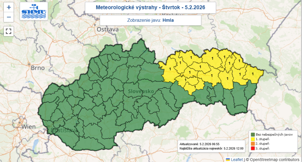 Výstraha platí do 10.00 h v okresoch Poprad, Kežmarok, Stará Ľubovňa, Sabinov, Gelnica, Spišská Nová Ves, Levoča, Prešov, Bardejov, Svidník, Stropkov, Medzilaborce, Snina, Humenné a Vranov nad Topľou: