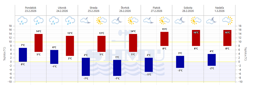 Od stredy (25. 2.) by sa malo počasie upokojiť. Bude prevažne polojasno. „Najvyššia denná teplota 8 až 13, na severe okolo 6 stupňov Celzia,“ uvádza SHMÚ.