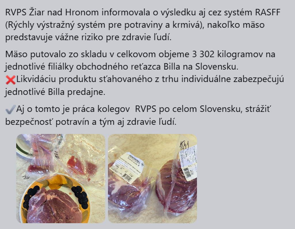 „Po dôkladnom prešetrení zo strany RVPS ako aj samotného obchodného reťazca Billa v prevádzkach sa nepotvrdila porušenosť a mäso nevykazuje žiadne známky pokazenia. V týchto prípadoch nie je dôvod likvidácie tohto tovaru na jednotlivých prevádzkach,“ uzavrela ŠVPS SR.