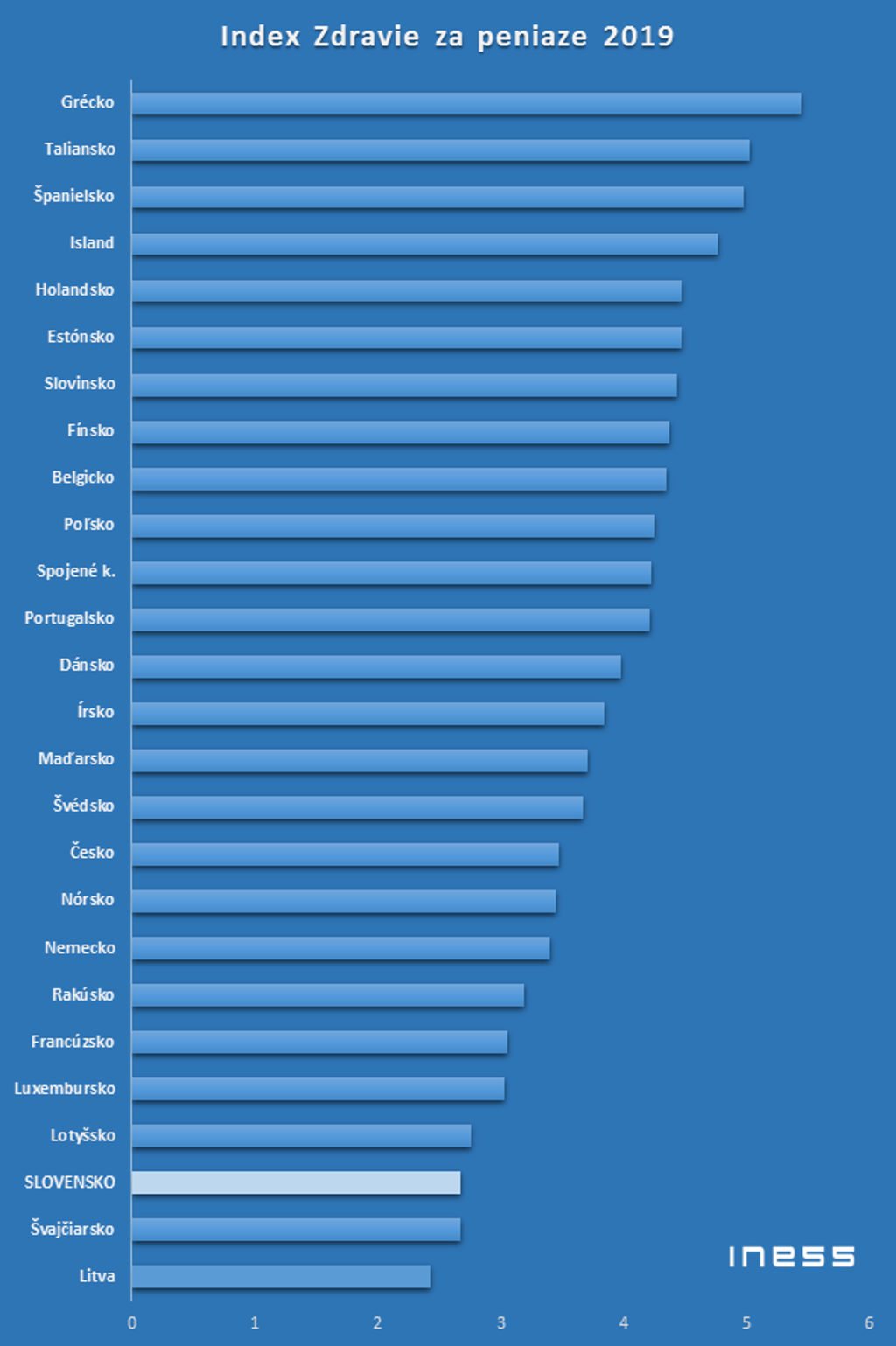 Analýza INESS pripomenula, že slovenské zdravotníctvo ročne spotrebuje viac ako päť miliárd eur. Inštitút vytvoril vlastný index s názvom Zdravie za peniaze.