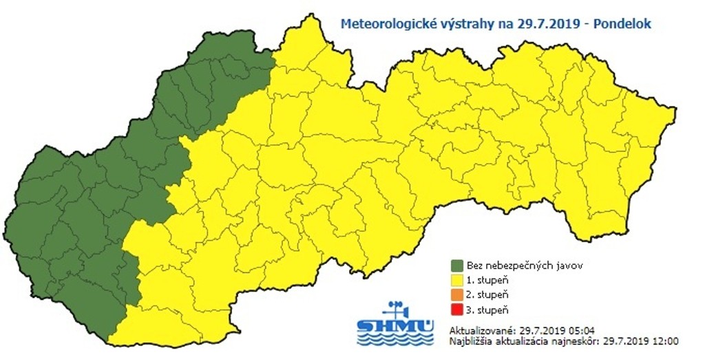 Výstraha prvého stupňa platí od pondelka 14.00 h do polnoci vo všetkých okresoch Banskobystrického, Košického a Prešovského kraja. Týka sa tiež niektorých okresov Trenčianskeho, Nitrianskeho a Žilinského kraja.
