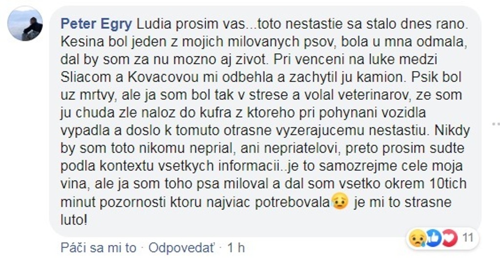 Na policajnom Facebooku zverejnil svoje vyjadrenie aj majiteľ psa. „Ľudia, prosím vás...toto nešťastie sa stalo dnes ráno. Kesina bol jeden z mojich milovaných psov, bola u mňa odmala, daj by som za ňu možno aj život...“