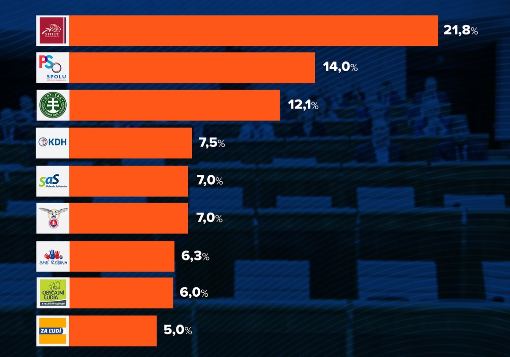 V Národnej rade SR by Smer-SD obsadil 38 kresiel, koalícia PS a Spolu - občianska demokracia by získala 24 mandátov, ĽSNS 21, KDH 13, SaS a SNS by mali zhodne 12 kresiel, Sme rodina 11, OĽaNO desať a Za ľudí deväť poslancov.