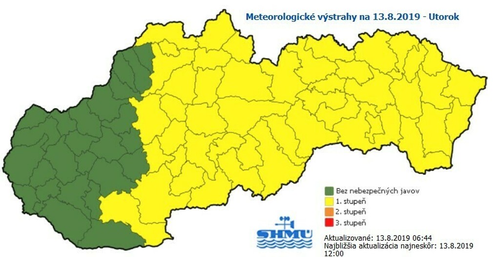V súvislosti s možnými prehánkami či búrkami vydal SHMÚ výstrahu 1. stupňa pre väčšiu časť krajiny, najzápadnejším okresom, pre ktorý výstraha platí, sú Nové Zámky: