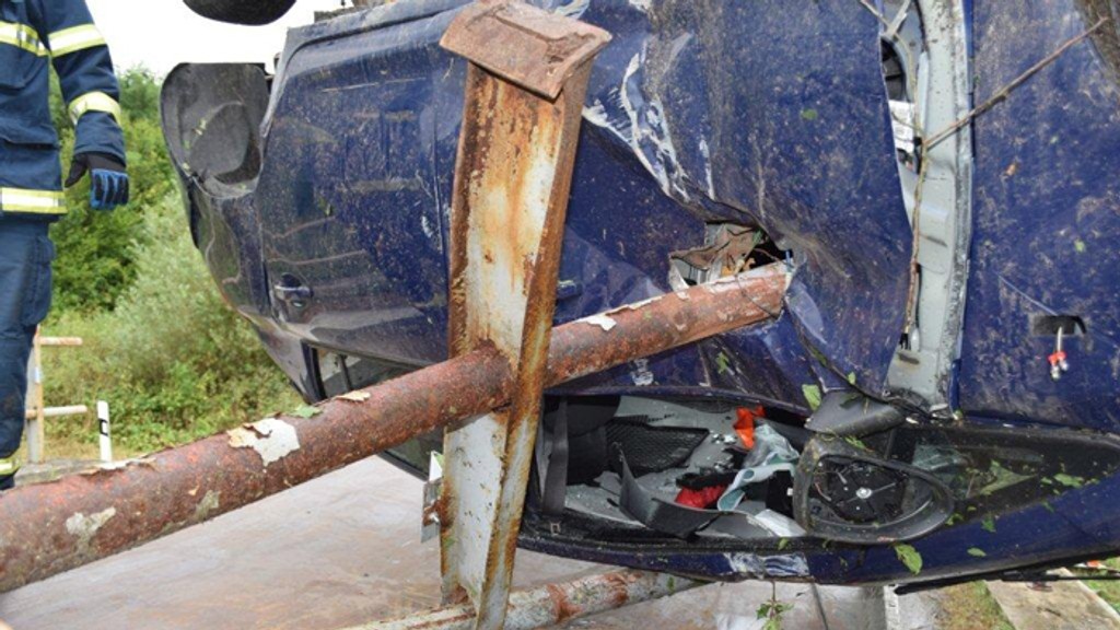 Následne zišiel z cesty vpravo, kde ľavou stranou auta narazil do zvislého dopravného značenia a kovového zábradlia mosta. Vozidlo sa následne prevrátilo na strechu do koryta miestneho potoka.