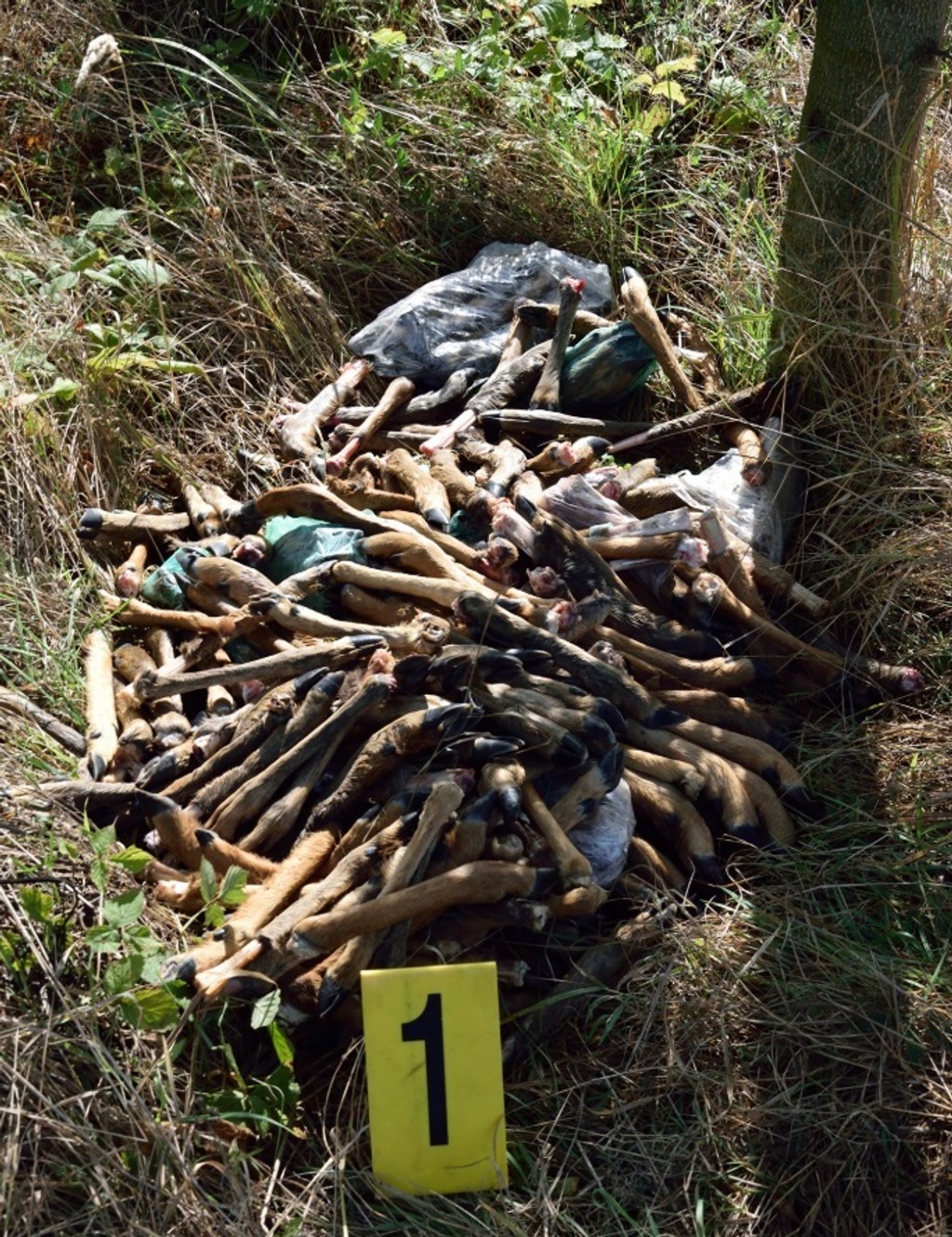 "Predseda poľovného revíru v Mojzesove našiel pri pravidelnej pochôdzke vedľa cesty voľne pohodené zvieracie pozostatky. Celkom išlo o 316 kusov končatín výlučne srnčej zveri, teda končatiny zo 79 zvierat," píšu na Facebooku policajti.