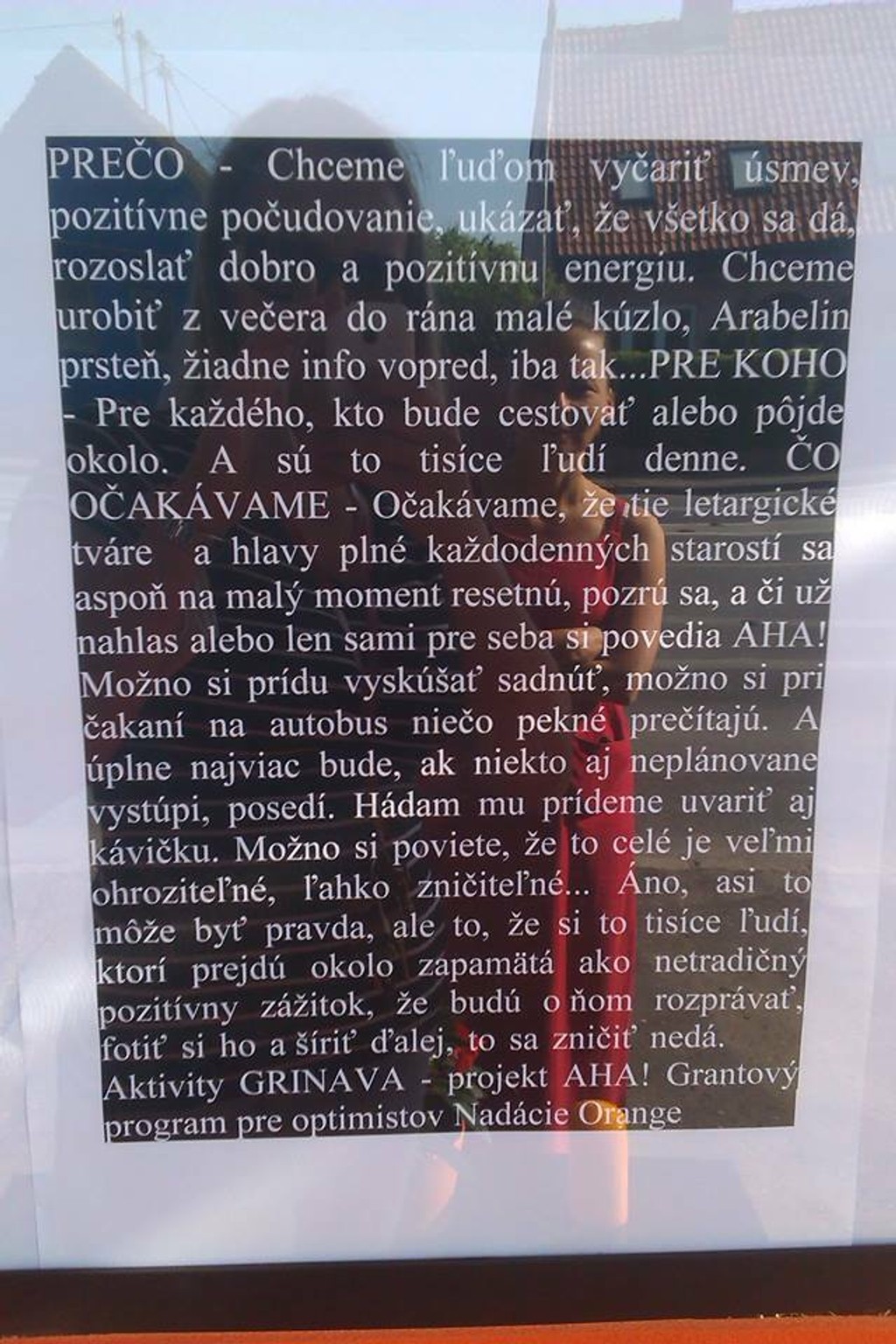 „Chceme ľuďom vyčariť úsmev, pozitívne počudovanie, ukázať, že všetko sa dá, rozoslať dobro a pozitívnu energiu. Chceme urobiť z večera do rána malé kúzlo, Arabelin prsteň, žiadne info vopred, iba tak," takto znie odkaz na zastávke.