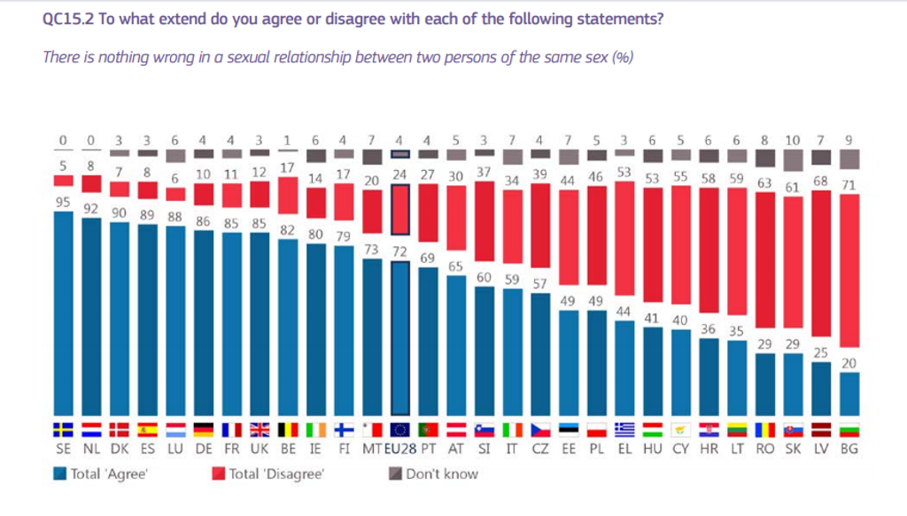 Na otázku "Nie je nič zlé na vzťahu medzi osobami rovnakého pohlavia" odpovedala kladne menej ako tretina Slovákov (29 percent). S výrokom nesúhlasili viac ako dve tretiny (61 percent). Naopak, s daným výrokom súhlasilo 95 percent Švédov.