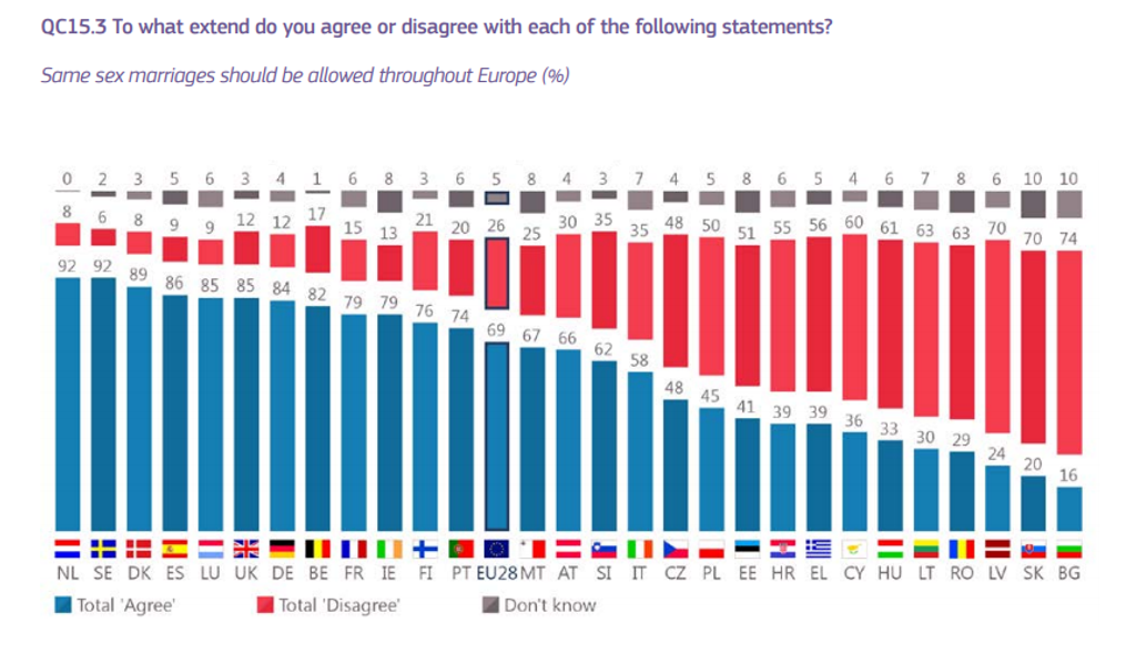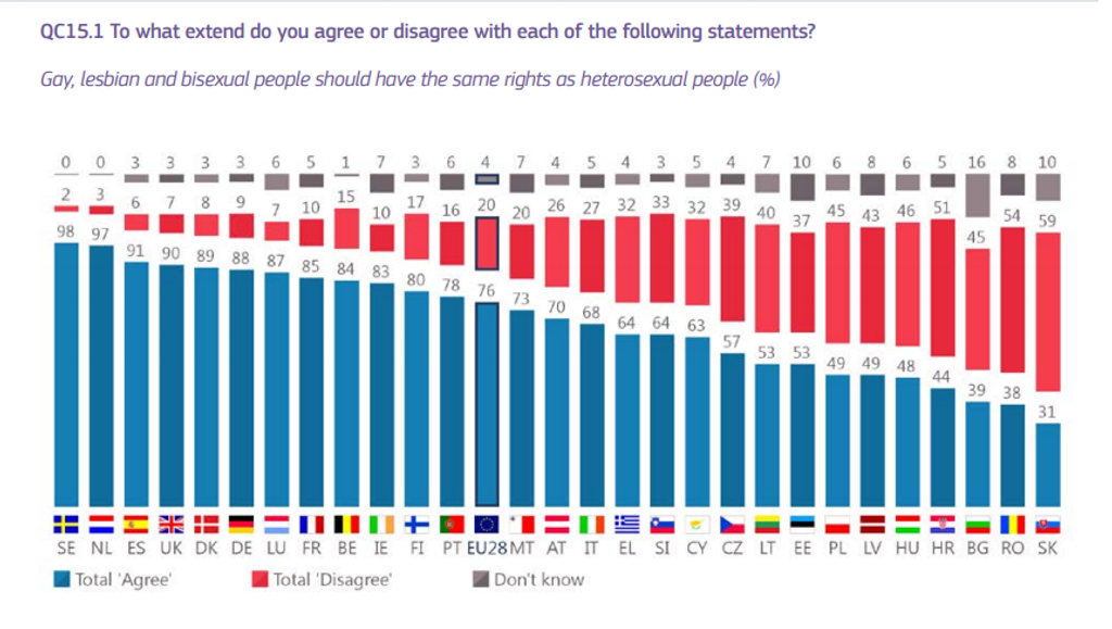 Najnovší prieskum Európskej komisie ukazuje, aký postoj majú Európania k právam LGBTI ľudí. Na otázku "Mali by mať gayovia, lesby a bisexuálni ľudia rovnaké práva ako heterosexuáli?" odpovedalo kladne 31 percent opýtaných Slovákov. Najmenej z celej Únie.