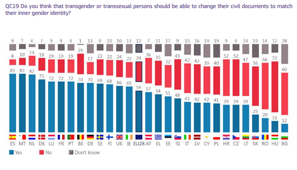 V otázke práv transľudí sú Európania konzervatívnejší. Na otázku "Mali by mať transludia právo zmeniť si doklady (napríklad, zmena rodu, pohlavia, rodného čísla, pozn.red.)? Kladne odpovedala štvrtina Slovákov (25 percent), nesúhlasí 56 percent.