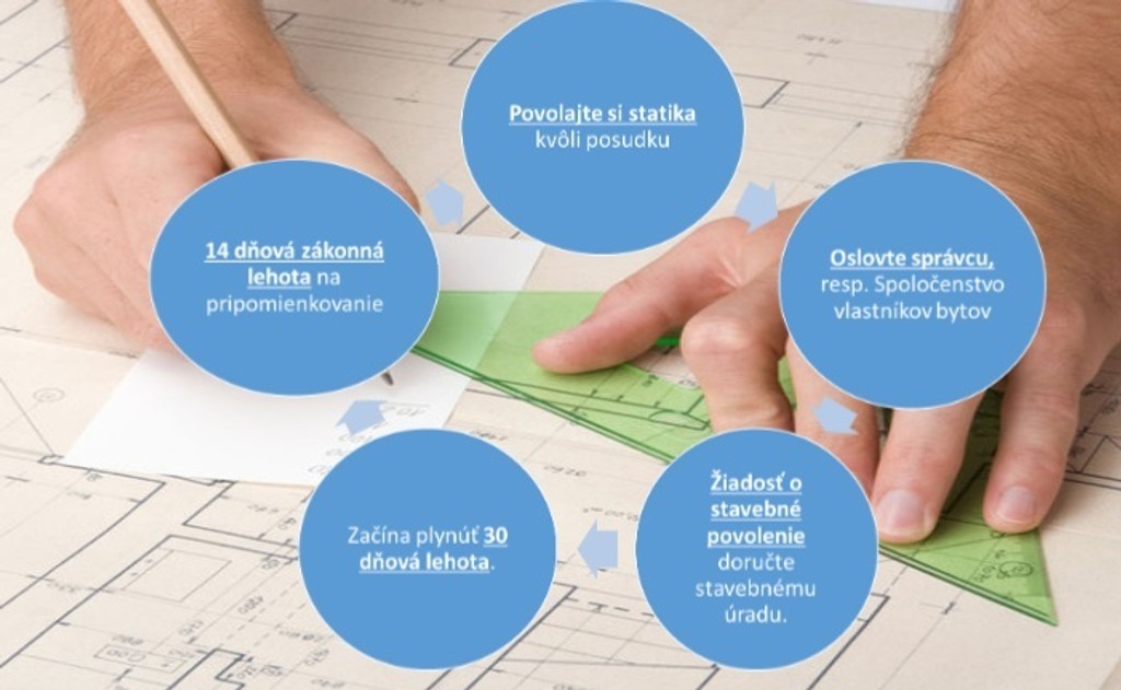 Žiadosť o stavebné povolenie musí obsahovať statikov posudok, ale aj pôvodný a budúci nákres bytu. Súhlas na výrazné zmeny v byte vám musí dať aj správca, prípadne spoločenstvo vlastníkov bytov.