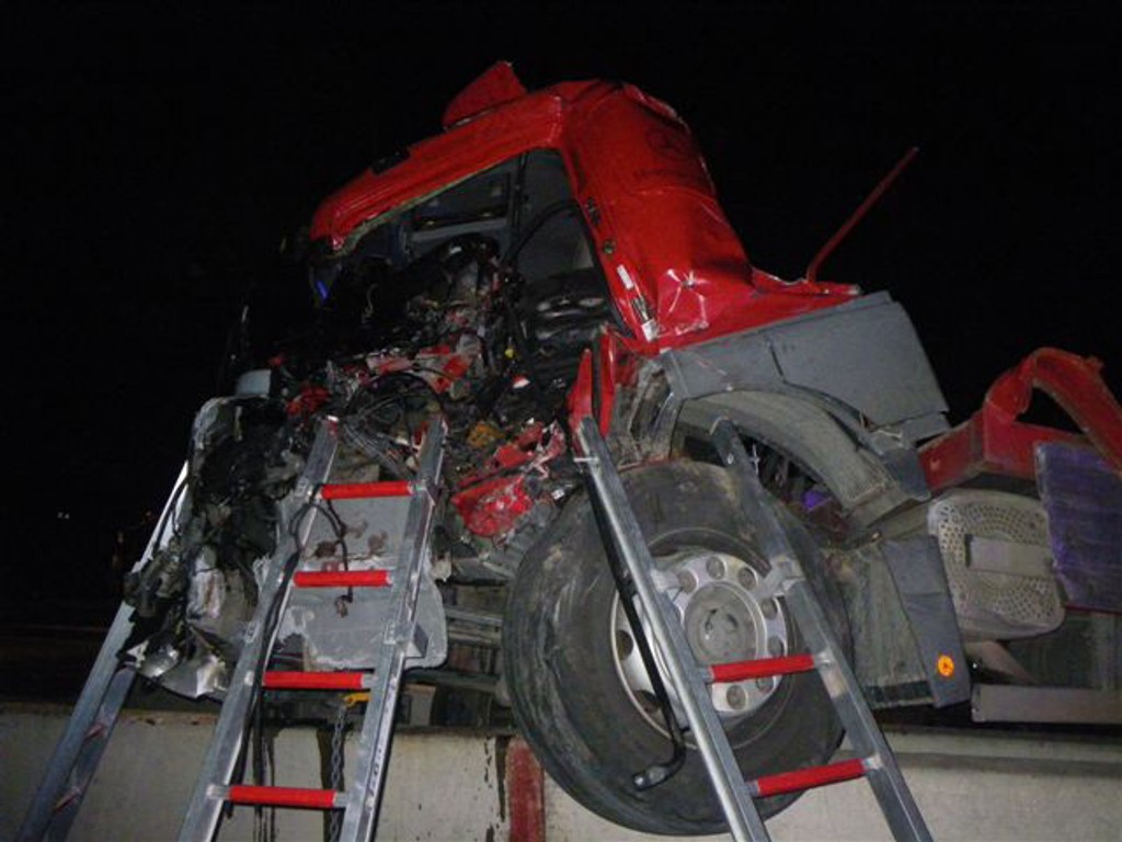 Predná časť auta zostala na zvodidlách a zadná skončila v protismere, z návesu sa mu navyše uvoľnilo prevážané Iveco, ktoré spadlo na cestu v protismere.