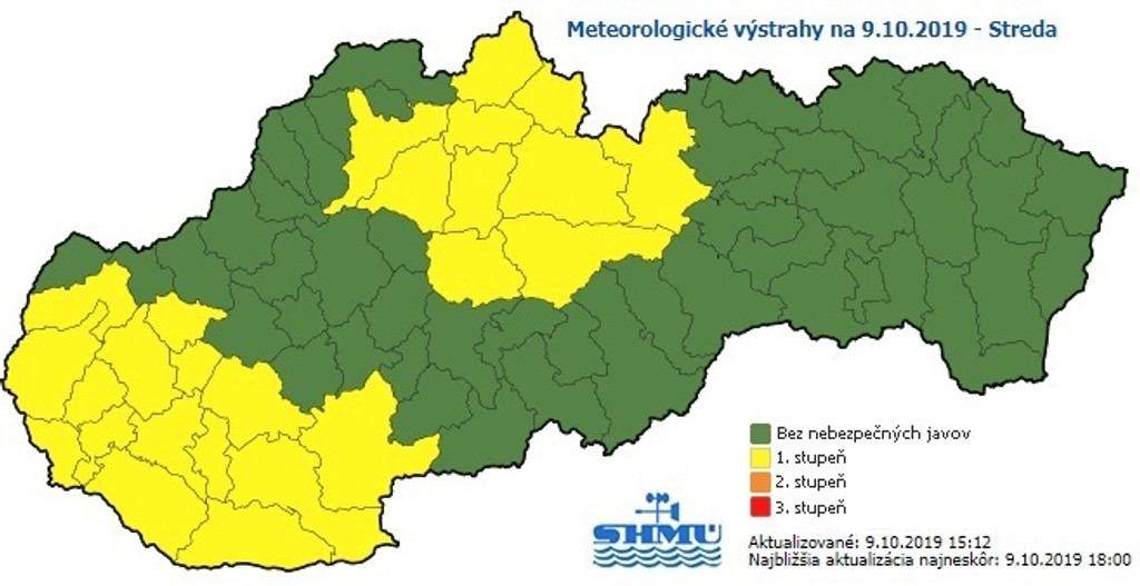 Vo viacerých okresoch Bratislavského, Nitrianskeho a Trnavského kraja môže od 21.00 h do štvrtka (10. 10.) do 1.00 h vietor dosiahnuť rýchlosť 45 až 50 kilometrov za hodinu. V nárazoch môže vietor dosiahnuť rýchlosť 65 až 85 kilometrov za hodinu.
