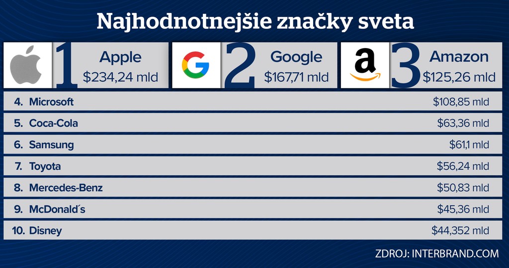 Interbrand vo svojej vo štvrtok zverejnenej výročnej štúdii vypočítal trhovú hodnotu značky Apple na 234 miliárd USD (212 miliárd eur). Jej hodnota medziročne stúpla o 9 %. Hodnota značky Google sa zvýšila o 8 % na 167,7 miliardy USD a Amazonu až o 24 % na 125,3 miliardy USD. Amazon tak zvýšil svoj náskok pred Microsoftom, Interbrand odhaduje hodnotu jeho značky na 109 miliárd USD.
