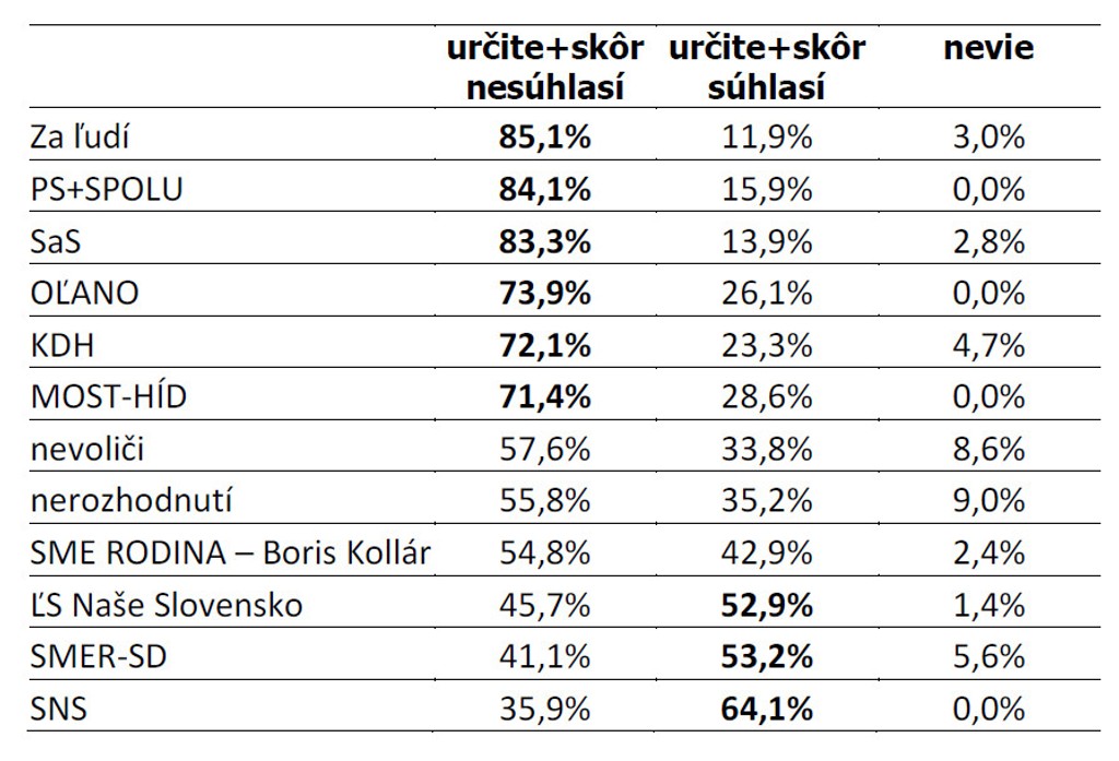 Z prieskumu tiež vyplýva, že nadpriemerný podiel respondentov, ktorí súhlasia so zavedením 50-dňového moratória, je medzi voličmi SNS (64 percenta), Smer-SD (53 percent) a ĽSNS (53 percent).