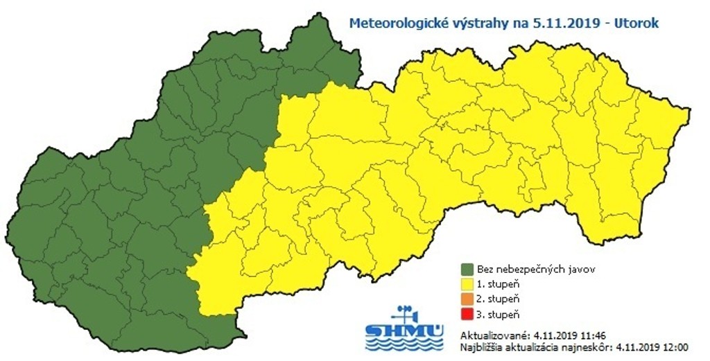 Slovenský hydrometeorologický ústav (SHMÚ) vydal na utorok 5. novembra výstrahy 1. stupňa pred dažďom pre väčšiu časť krajiny, ide o okresy stredného a východného Slovenska.