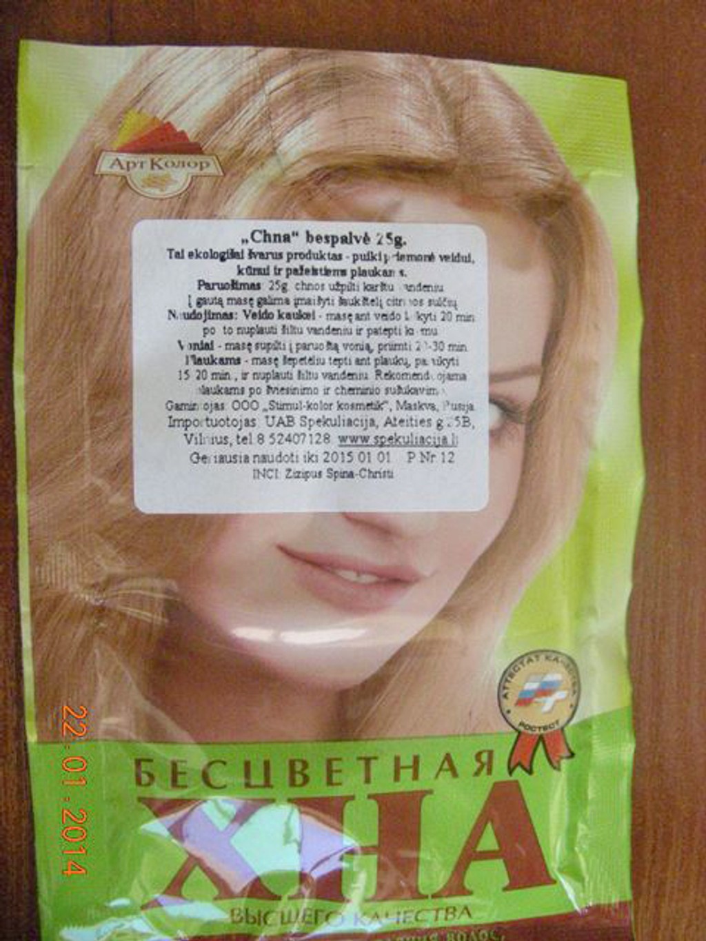 Názov farby na vlasy je Natural hair dye značky ArtKolor, výrobná dávka/typ: (expiry date) lot No. 01 01 15, čiarový kód: 460212100382. Krajinou pôvodu je Ruská federácia. Henna farba je balená v 25 mg plastových vreckách, na prednej strane vrecka je obrázok ženy s blond vlasmi a na zadnej strane popis výrobku. V tomto výrobku bol zistený prekročený povolený limit pre celkový počet mikroorganizmov, pri jeho použití môžu vzniknúť infekcie.