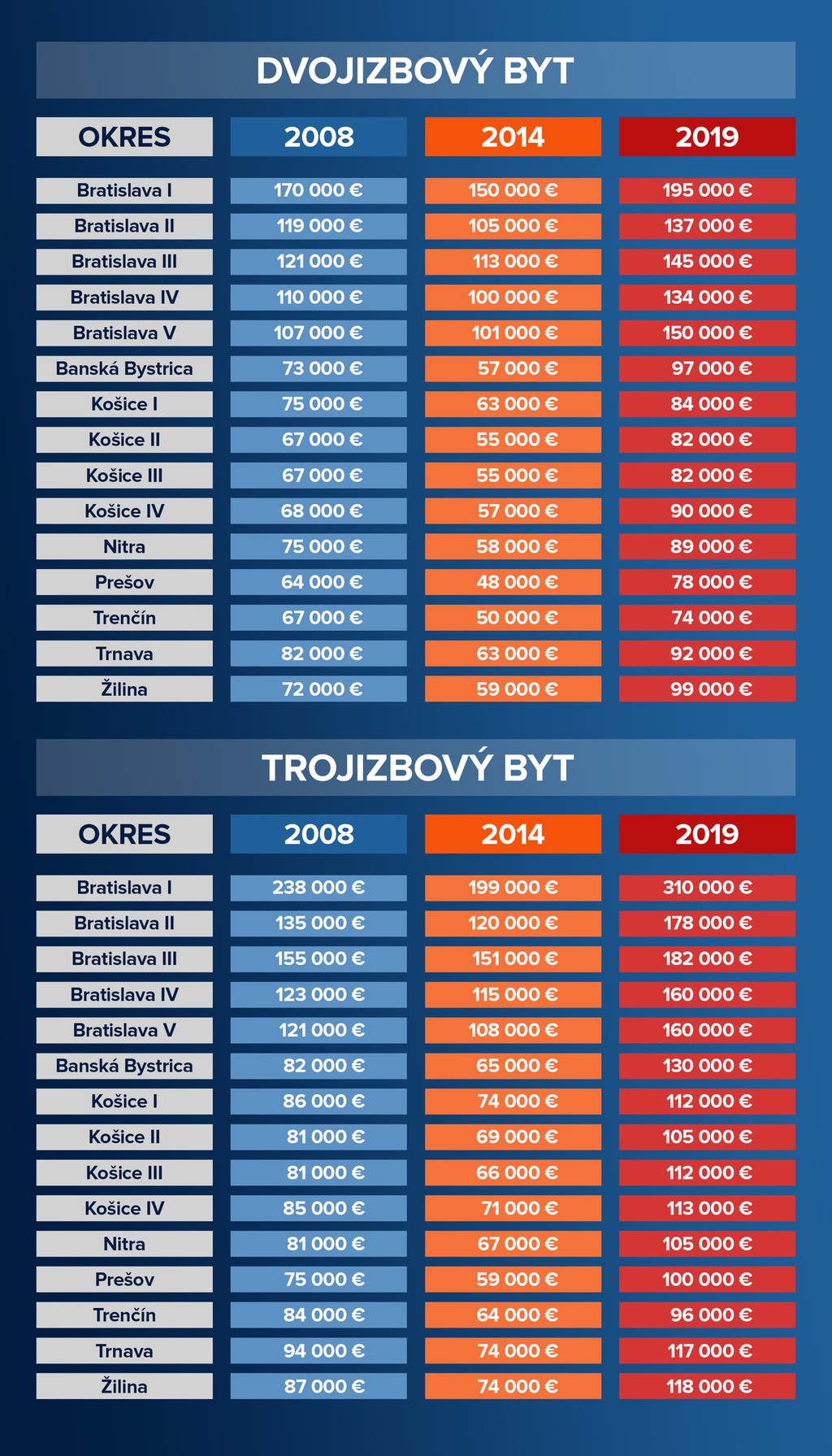 V celoslovenskom meradle vedú rebríček najdrahších 2-izbových bytov po Bratislave, Banská Bystrica a Žilina. Rovnako idú hore aj trojizbové byty.