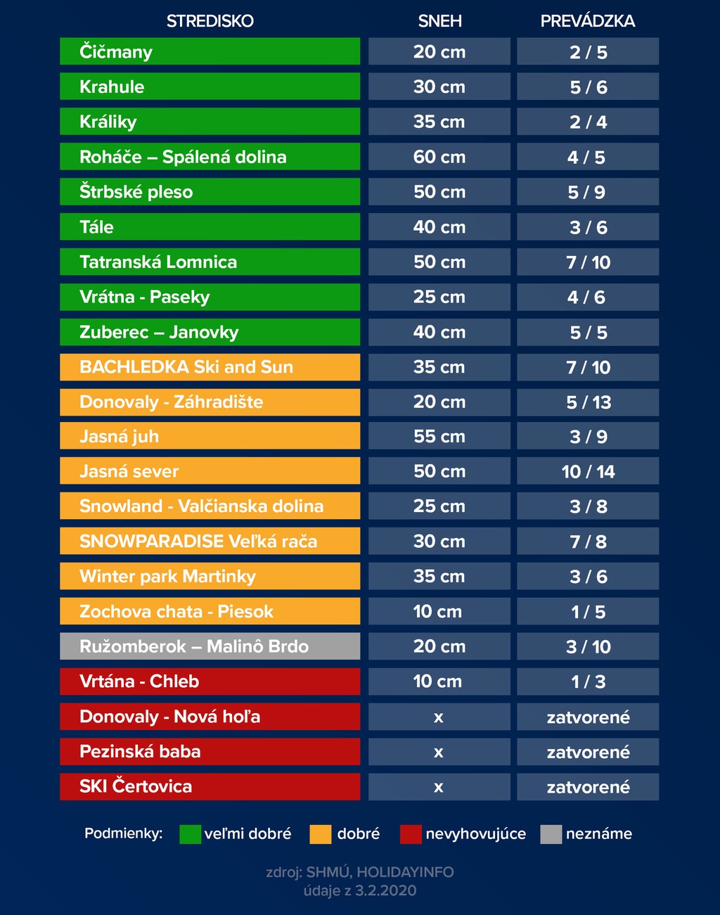 Sezónu rozbehlo už viac ako 60 stredísk, no vo väčšine z nich je potrebné počítať s čiastočnou prevádzkou. Polovica areálov má k dispozícii pod 50 percent zjazdoviek. Počet upravených tratí v strediskách sa však vďaka chladnejším dňom, ktoré umožnili výrobu technického snehu, zvýšil. Vo štvrtok sa zasnežovalo predovšetkým v nižších polohách, keďže vo vysokohorských lokalitách prevládalo inverzné počasie s plusovými teplotami, ktoré pokračuje aj v piatok.