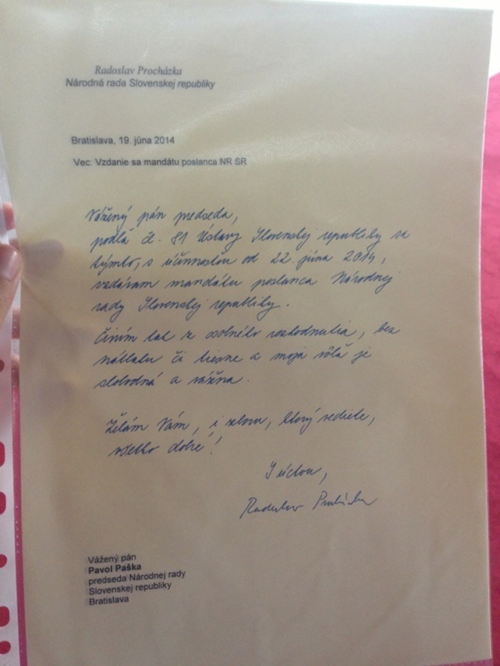 Poslanec NRSR Radoslav Procházka, ktorý založil novú politickú stranu Sieť, sa vzdal poslaneckého mandátu. Dnes odišiel do podateľne a jeho vzdanie sa mandátu nadobúda účinnosť v nedeľu.