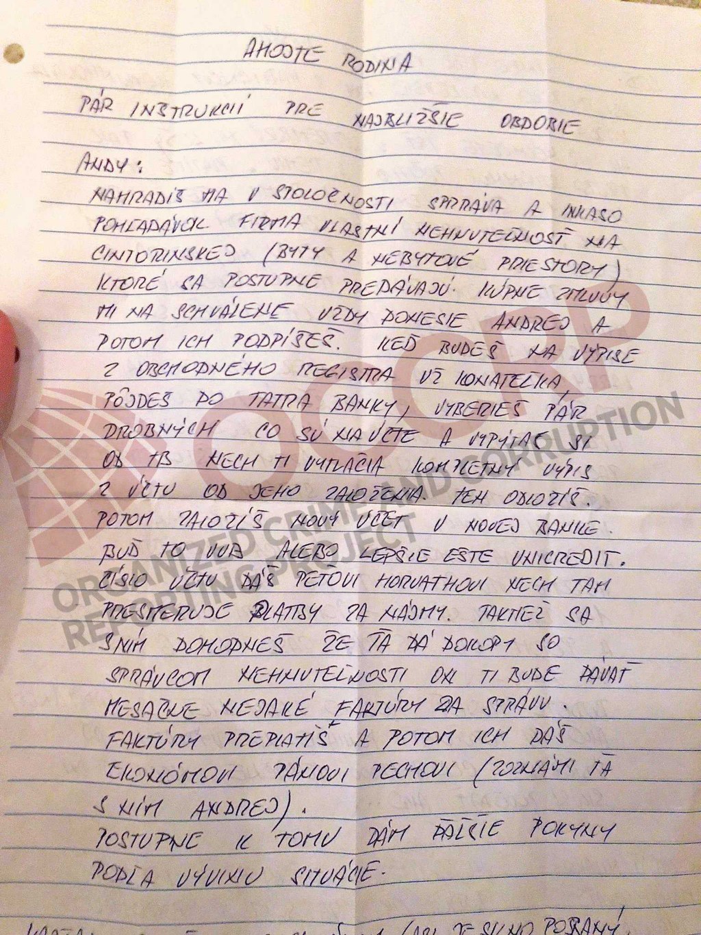 "Ahojte rodina," začína Kočner pozdravom. Hneď pokračuje s tým, že posiela pár inštrukcií na najbližšie obdobie. Moták obsahuje postup, ako sa má stať z dcéry Mariana Kočnera, ktorú v liste familiárne nazýva Andy, nová vlastníčka firmy Správa a inkaso pohľadávok, známej z viacerých káuz. Firma vlastní nehnuteľnosť na Cintorínskej ulici (byty a nebytové priestory), ktoré sa postupne predávajú. Na záver píše, že podľa vývinu situácie dá ďalšie pokyny.
