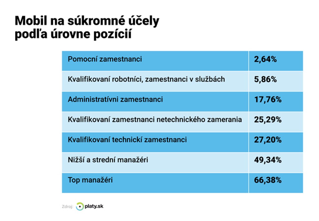 Analýza portálu ďalej odhalila, že na Slovensku sú iba necelé tri percentá pomocných pracovníkov, ktorí majú k dispozícii mobil na súkromné účely a účet im hradí zamestnávateľ.
