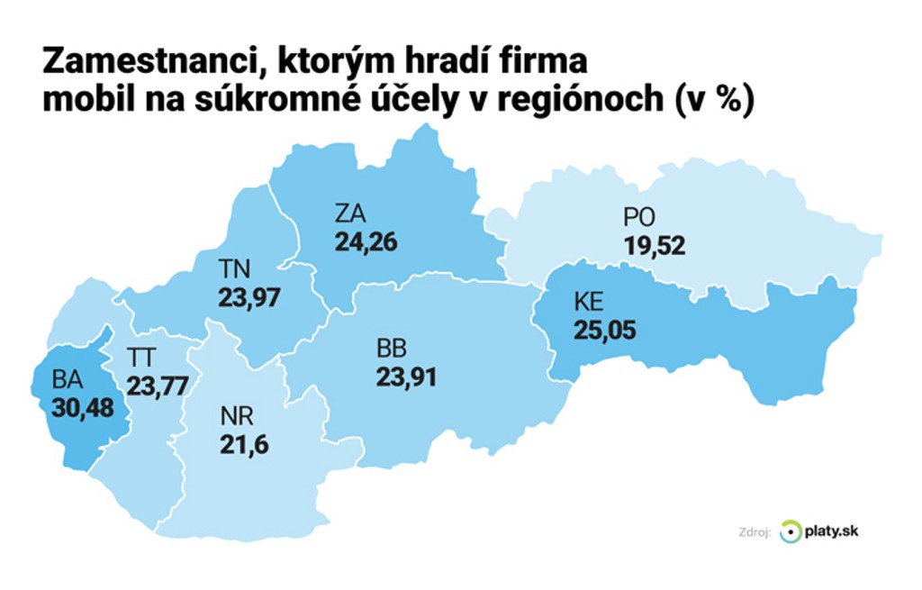 Portál sa na tento benefit pozrel aj na to, ako je to v ôsmich krajoch Slovenska. Tak ako je to pri platoch či dostupnosti voľných pracovných miest, regionálne rozdiely sú aj pri rozšírenosti nefinančných benefitov. Mobil na súkromné účely je od zamestnávateľov najviac rozšírený v Bratislavskom a Košickom kraji. Naopak, najmenej v Prešovskom a Nitrianskom kraji.