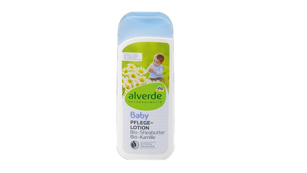 Nebezpečné môže byť detské telové mlieko Baby Pflegelotion - Baby body lotion značky dm alverde z Nemecka v bielej plastovej 200-mililitrovej fľaši s bledomodrým uzáverom.