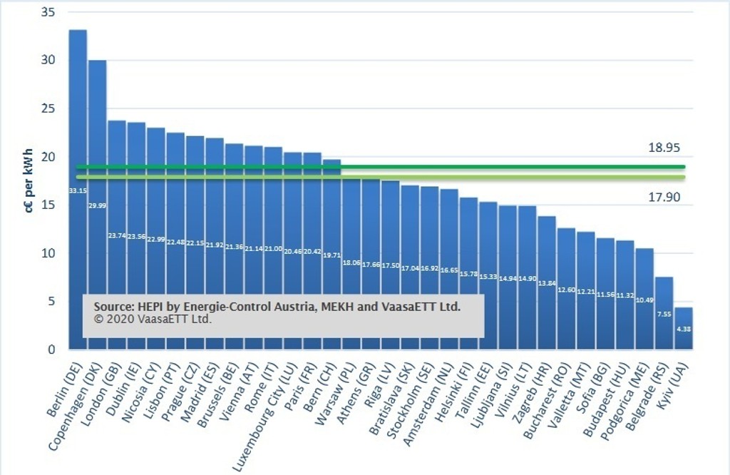 Maďarský energetický úrad, v spolupráci s fínskou a rakúskou organizáciou, zverejnil porovnanie cien elektriny v hlavných mestách Európy
