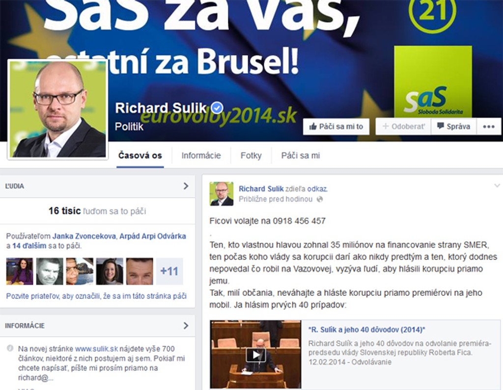 Predseda SaS Richard Sulík dnes na sociálnej sieti zverejnil telefónne číslo premiéra Roberta Fica, aby mu ľudia mohli priamo oznamovať prípady korupcie. Zverejnené telefónne číslo Fico podľa informácií SITA niekedy naozaj používal.