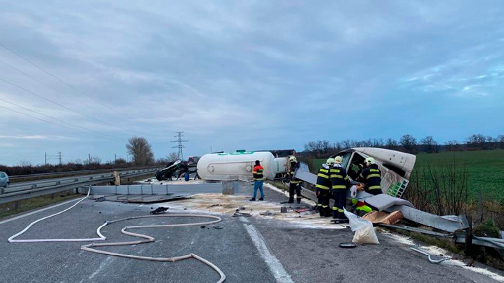 Na D2 smerom do Maďarska sa prevrátil kamión, cesta nie je stále prejazdná.