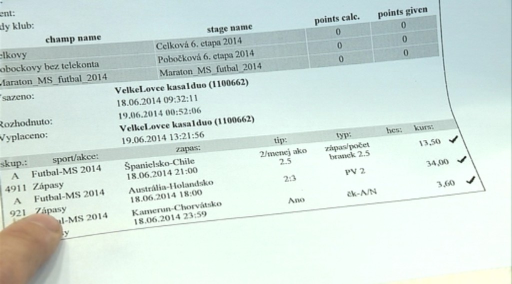 Stávkovať sa dá na všetko. Husárske kúsky v stávkovaní máme aj u nás. Napríklad tipujúci vo Veľkých Lovciach v trojkombinácii správne tipol všetky výsledky zápasov: Španielsko prehrá s Čile, že v zápase Kamerun - Chorvátsko bude červená karta a uhádol aj presný výsledok zápasu Austrálie s Holandskom. Pri vklade 1 euro to znamenalo výhru 1600 euro.