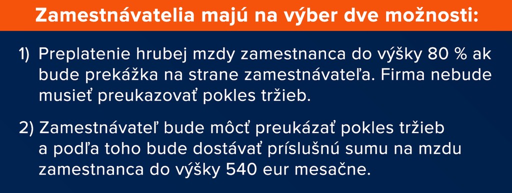 Kompenzácia zo strany štátu bude spočívať v poskytovaní príspevku pre zamestnávateľov zasiahnutých mimoriadnou situáciou, a to na úhradu časti mzdových nákladov ich zamestnancov a v poskytovaní príspevku pre samostatne zárobkovo činné osoby (SZČO) alebo iné fyzické osoby na kompenzáciu výpadku ich príjmov zo zárobkovej činnosti.