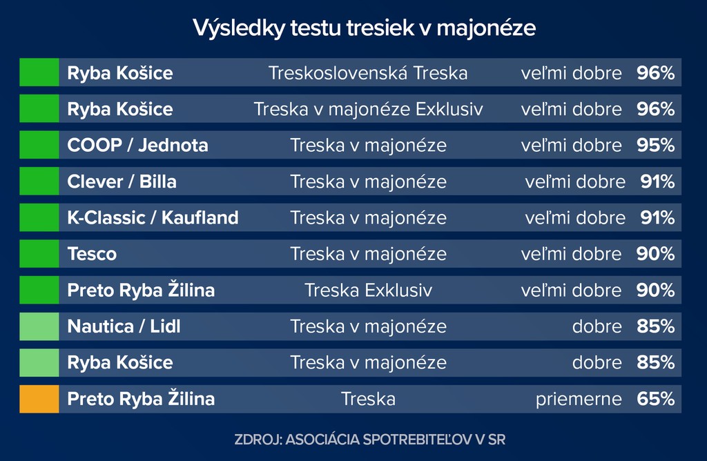 Víťazom testu sa stali dve tresky z košickej Ryby - Treska treskoslovenská a Treska Exklusiv. Za nimi tiež so známkou veľmi dobre skončili tresky v majonéze značiek COOP, CLEVER, K-Classic, Tesco a Treska Exklusiv Preto Ryba Žilina. O stupeň horšie so známkou dobre skončili: Nautica z Lidlu a Treska v majonéze odRyby Košice. Na konci so známkou priemerne skončila Treska zo žilinskej firmy Preto Ryba.