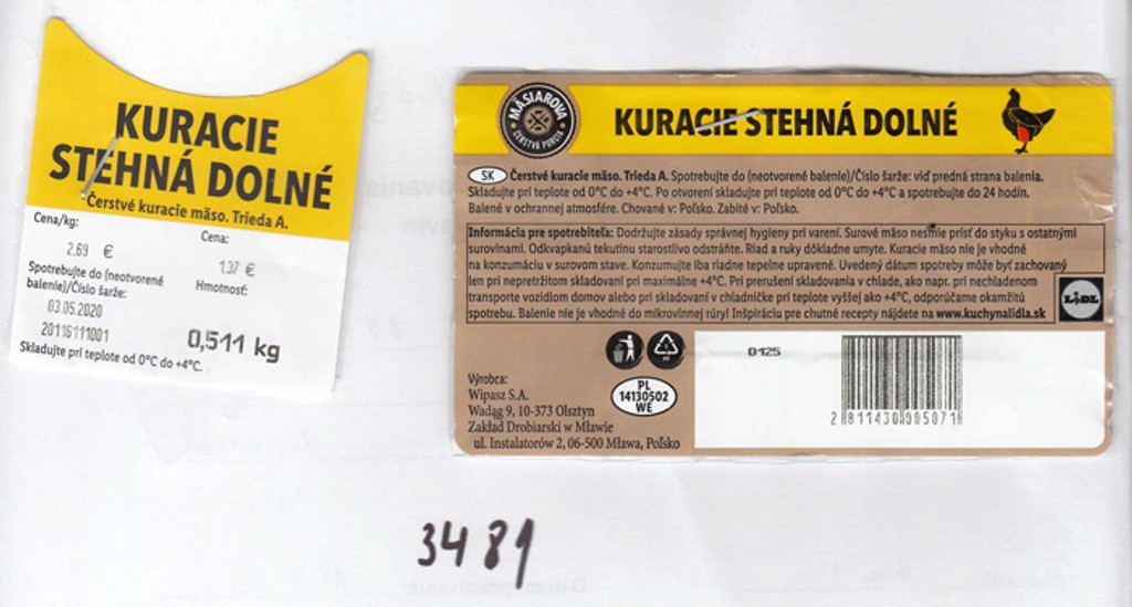 "Počas druhého májového týždňa ŠVPS informovala o stiahnutí ďalších dvoch nevyhovujúcich výrobkov z hydinového mäsa s krajinou pôvodu Poľsko, a to chladenej kuracej štvrte (výrobca Firma Handlowa Export Import Wojciech Machaj Zaklad Rozbioru Drobiu, predajňa Madex Invest, s. r. o., Ružomberok, nedostatok Salmonella Enteritidis), ako aj kuracích dolných stehien (výrobca Wipasz S. A., predajňa Lidl, Liptovský Mikuláš, nedostatok Salmonella Enteritidis)," priblížil.