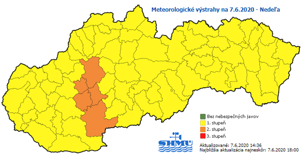 Od nedeľňajšieho popoludnia platí výstraha pred búrkami prvého stupňa pre celé Slovensko, búrková činnosť môže trvať až do pondelkového (8. 6.) večera, na juhozápade platí výstraha do pondelkového rána.
