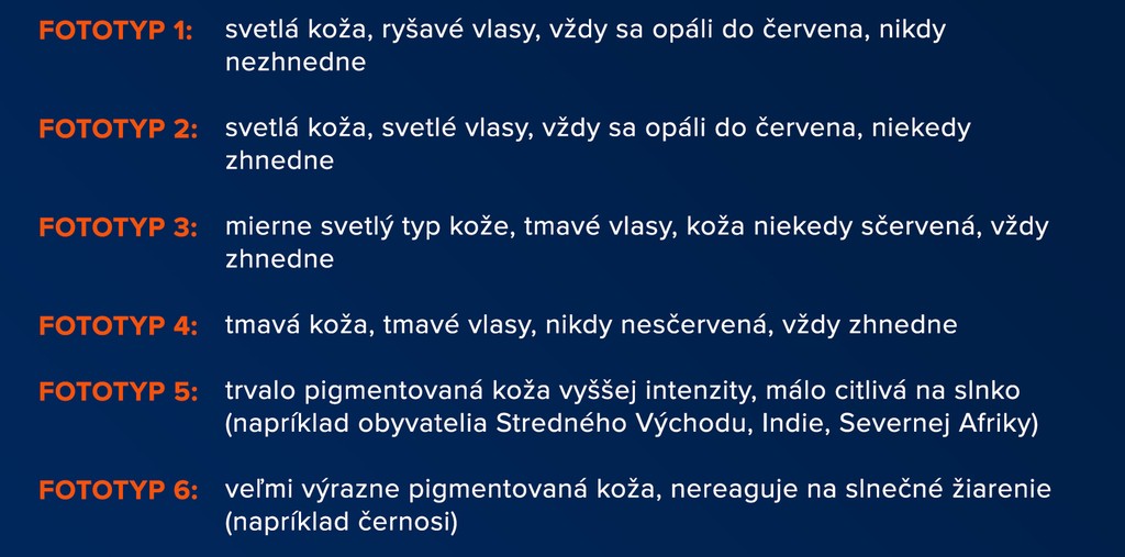 Odborníci rozlišujú ľudí podľa reakcie kože na ultrafialové žiarenie. Na základe toho vzniklo šesť skupín tzv. fototypy kože.