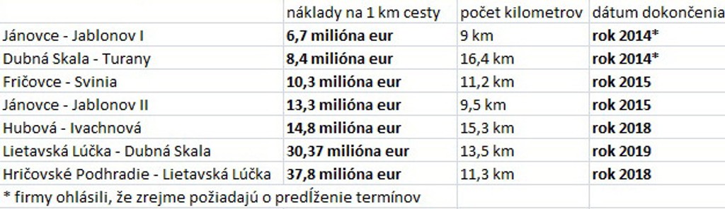 O úsekoch Jánovce - Jablonov I či Dubná Skala - Turany, na ktoré vyberali staviteľov počas vlády Ivety Radičovej, sa navyše špekuluje, že si firmy v snahe získať zákazku vypýtali menej než sú reálne náklady.