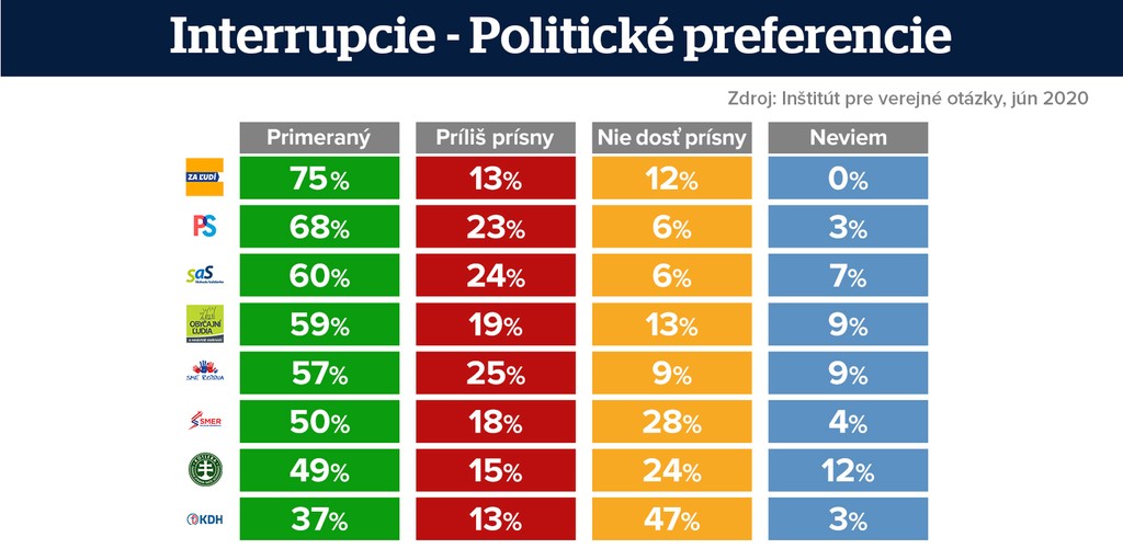 Za zachovanie dnešnej podoby interrupčného zákona sa nadpriemerne často prihovárajú priaznivci strany Za ľudí (75%), Progresívne Slovensko (68%), a Sloboda a solidarita (60%), OĽaNO (59%) a Sme Rodina (57%).