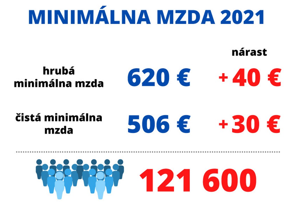 Minimálna mzda na rok 2021 by mala predstavovať 620 eur. Návrh v tejto podobe predkladá ministerstvo práce do medzirezortného pripomienkového konania. Uviedol to v stredu na tlačovej konferencii v Národnej rade (NR) SR šéf rezortu práce Milan Krajniak (Sme rodina). Zároveň avizoval zavedenie takzvanej štartovacej mzdy pre dlhodobo nezamestnaných.