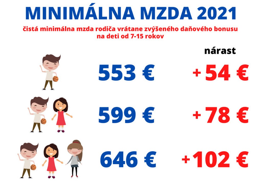 V praxi to podľa Krajniaka znamená, že ak bude na minimálnu mzdu pracovať rodič jedného dieťaťa, jeho príjem bude v porovnaní s týmto rokom o 54 eur mesačne vyšší. V prípade dvoch detí má byť podľa ministra čistý príjem vyšší o 70 eur, pri troch deťoch by mal príjem stúpnuť o 102 eur mesačne.