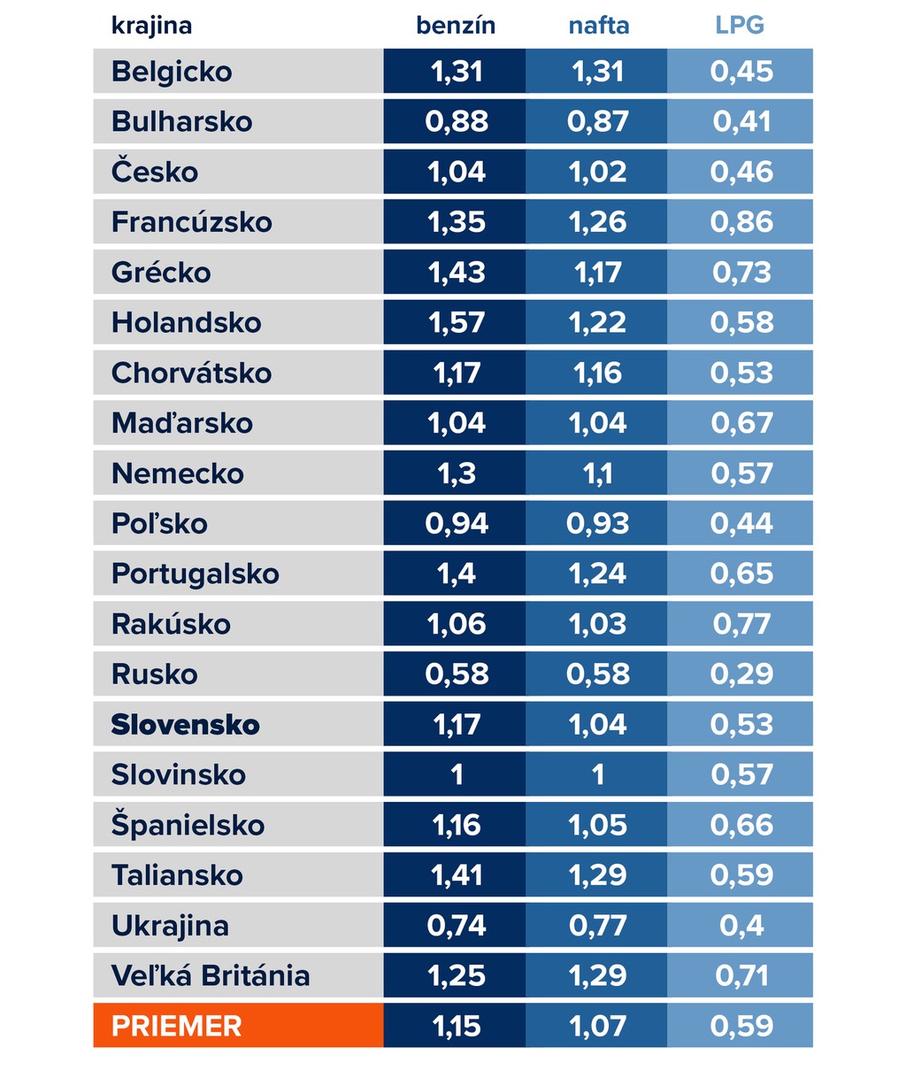 Tabuľka priemerných cien PHM v krajinách Európy (v eurách):