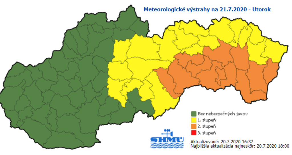 „Je zvýšená pravdepodobnosť výskytu silných búrok s krúpami s priemerom aj viac ako 2 cm, ktoré predstavujú nebezpečenstvo pre ľudské aktivity. S búrkami môžu byť spojené prívalové zrážky s úhrnmi 30 - 50 mm a nárazy vetra s rýchlosťou 20 - 28 m/s (70 - 100 km/h)," píše meteorológia zo SHMÚ.